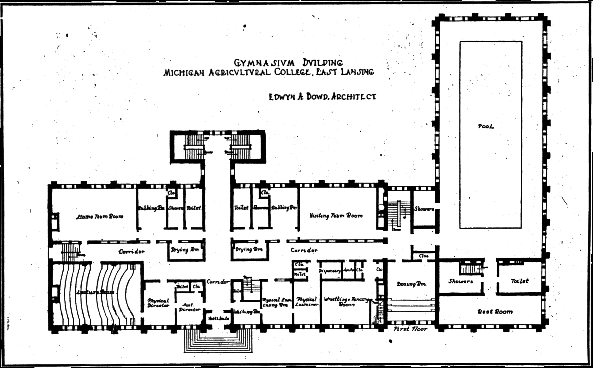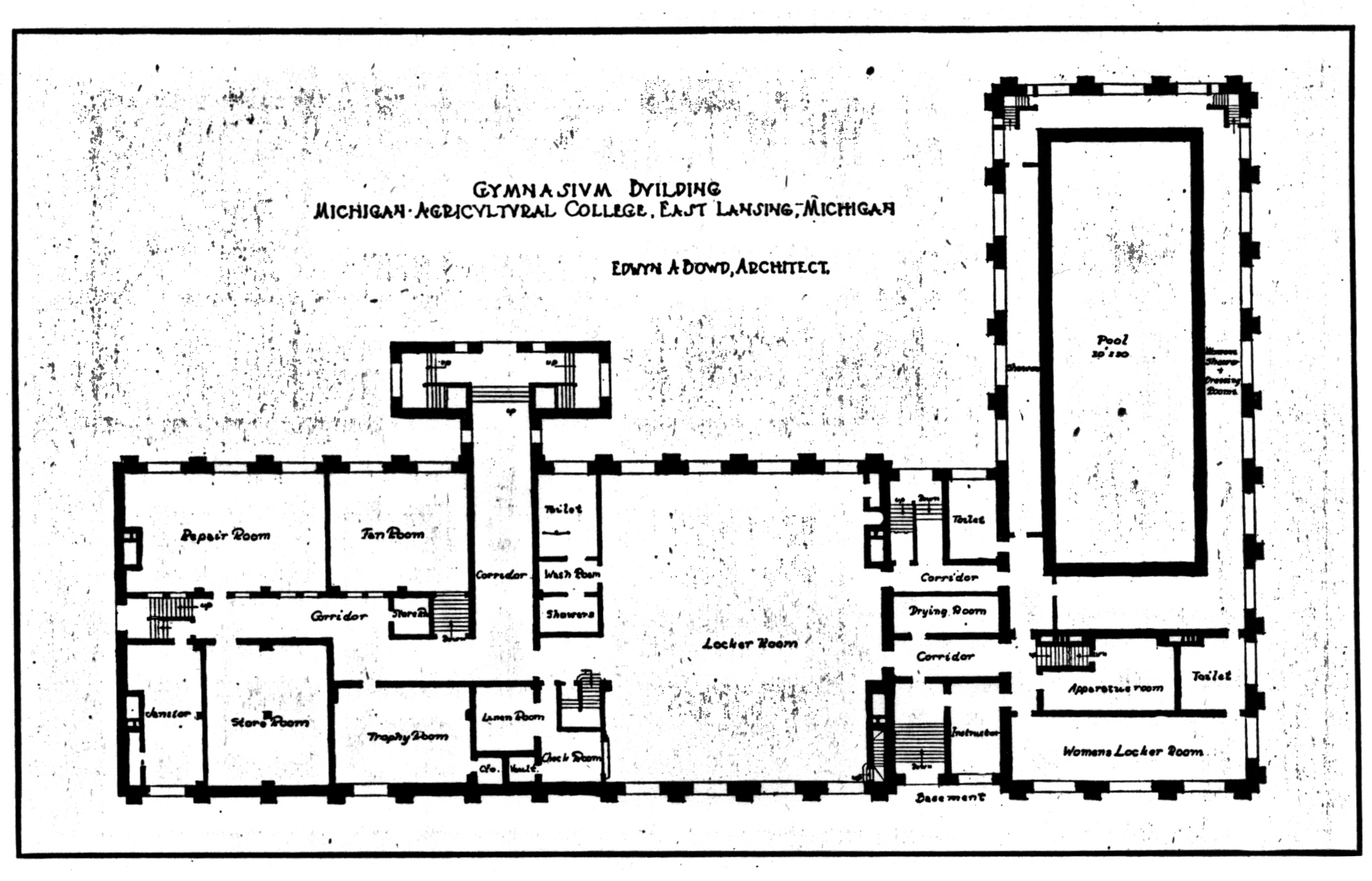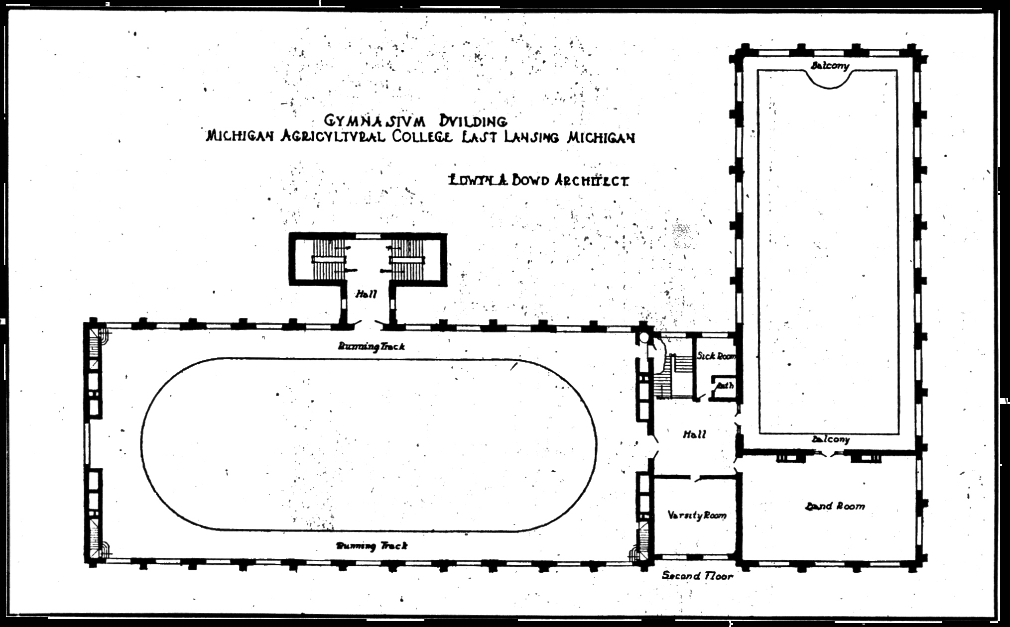 The Gymnasium Building is now known as the Intramural Sports Circle Building. This illustration and set of floor plans show the building before the “new” swimming pool addition on the Red Cedar River side of the building and before the office and gymnasium addition on the Beal Garden side of the building.